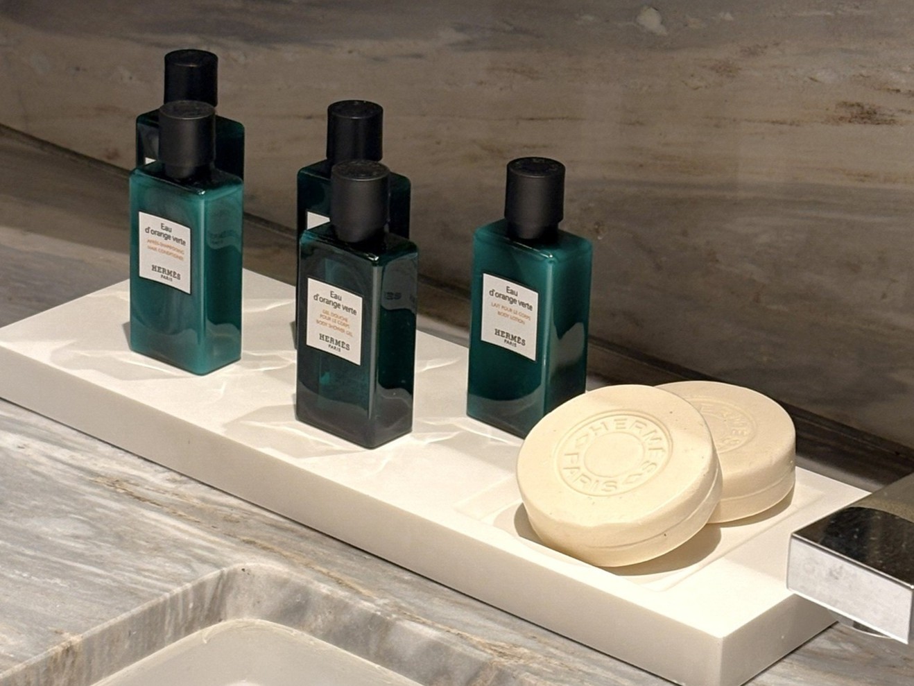 The collection includes iconic scents such as Eau d’Orange Verte, Un Jardin Sur Le Nil, and Eau de Citron Noir, as well as hotel-exclusive bath and body essentials crafted with the signature Hermès elegance.